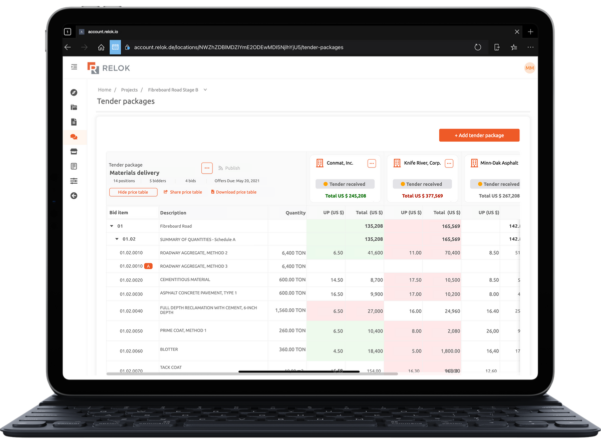 With Relok your invited bid partners enter prices electronically which enables to compare and analyse tenders in realtime.